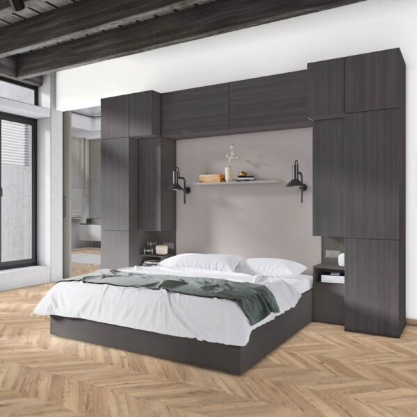 - A grey wood effect with a fine grain texture and a matt finish.