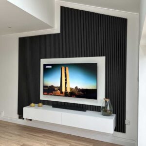 A high-quality oak faced veneer black MDF tongue & groove wall panelling that is available to order online in a choice of two thicknesses and a selection of pitches.