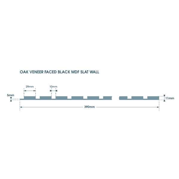 The Oak Faced Black MDF Slat panels are supplied to us as full size boards. Once we receive your order, the face of the board is machined with a 10mm wide x 6mm deep groove and then cut into 390mm wide sections.